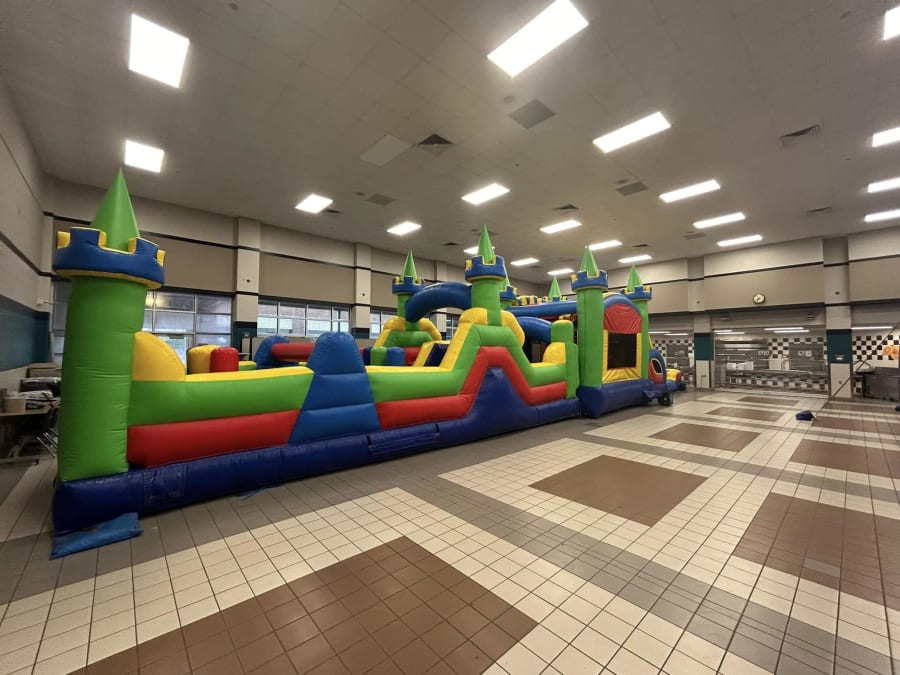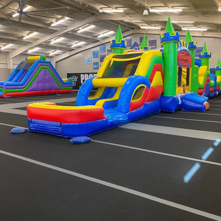 This brightly colored unit also features horizontal log jams, tunnels, and vertical obstacle poles, as well as a huge bounce house!