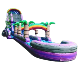 This vibrant and eye-catching water slide is perfect for all ages, from kids to adults. With its dual lanes, it allows two participants to race side by side, adding an element of friendly competition and excitement. The slide features a towering palm tree design in a striking purple color, creating a tropical oasis atmosphere that will transport your guests to a beach paradise.