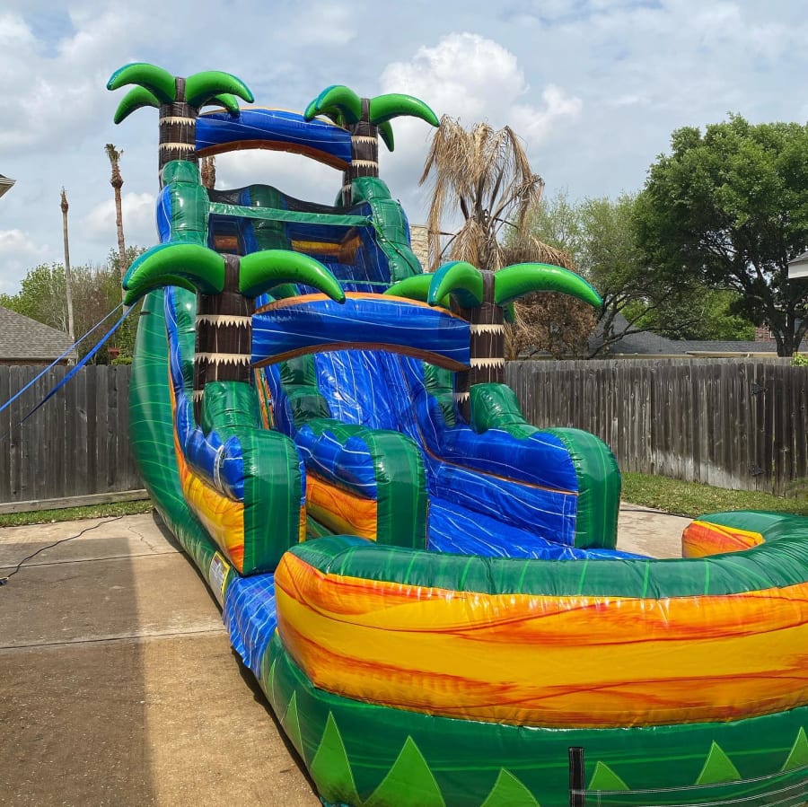 Looking for a good way to cool off with some adrenaline-pumping fun? Our 18' Tropical Water Slide is the perfect way to cool off during these Hot Texas days or have heart-pounding fun during the fall!!